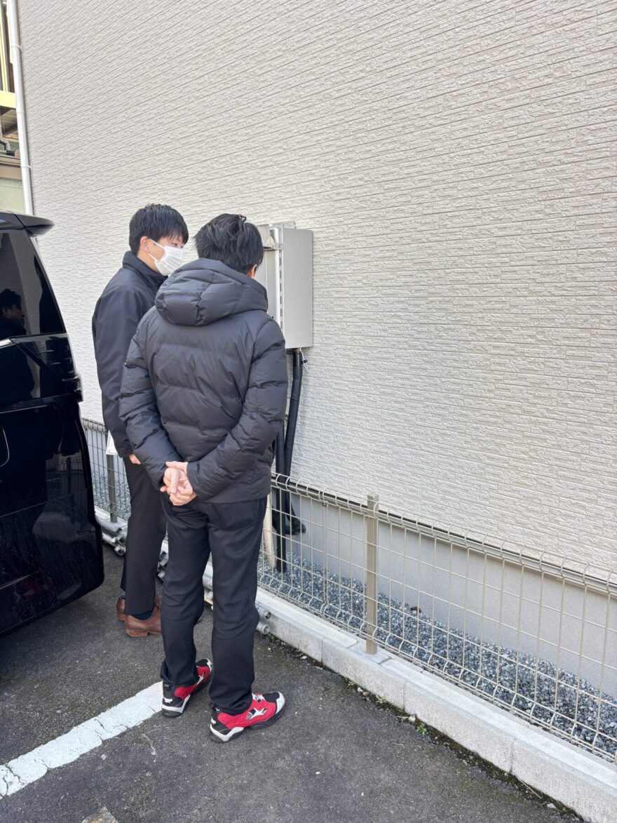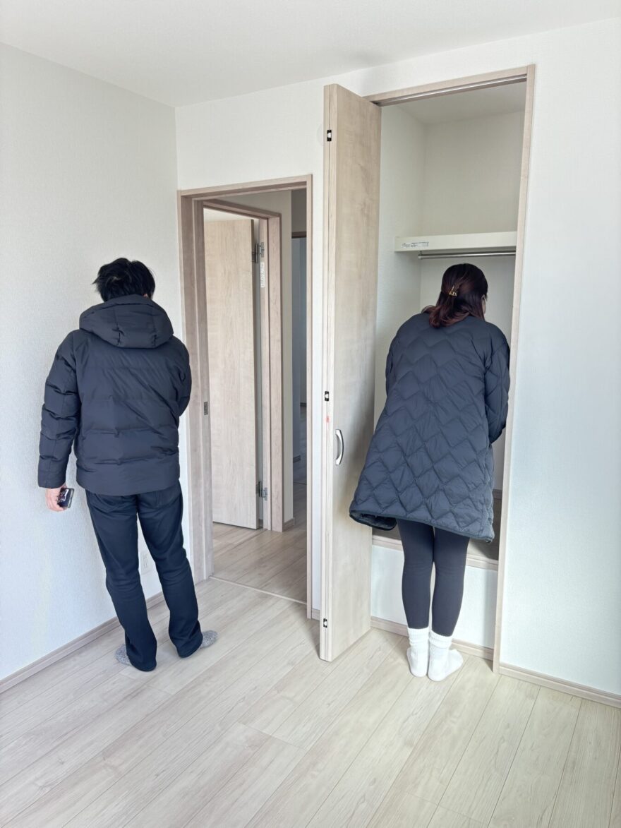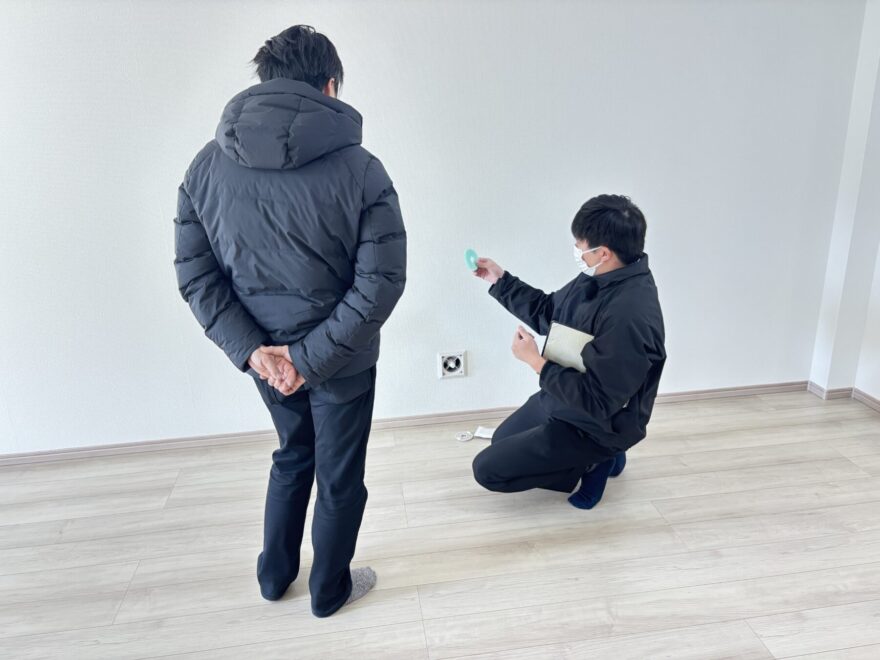 立ち会い検査後にはK様がキッチン回りの採寸を行いました。これから新調される食器棚や冷蔵庫のサイズ確認の為!引渡し前に荷物の搬入は一切出来ませんが、カーテンサイズや家具配置の採寸は可能です。